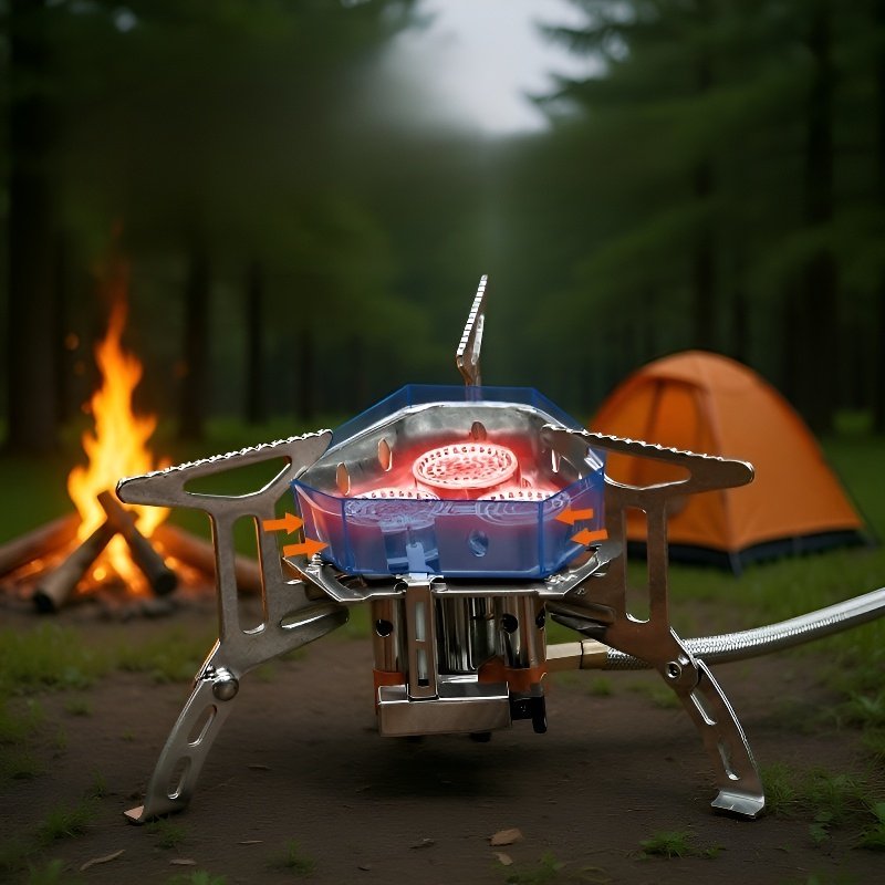 屋外調理に適した、3 つの防風バーナーヘッドを備えたポータブル カセット ストーブです。